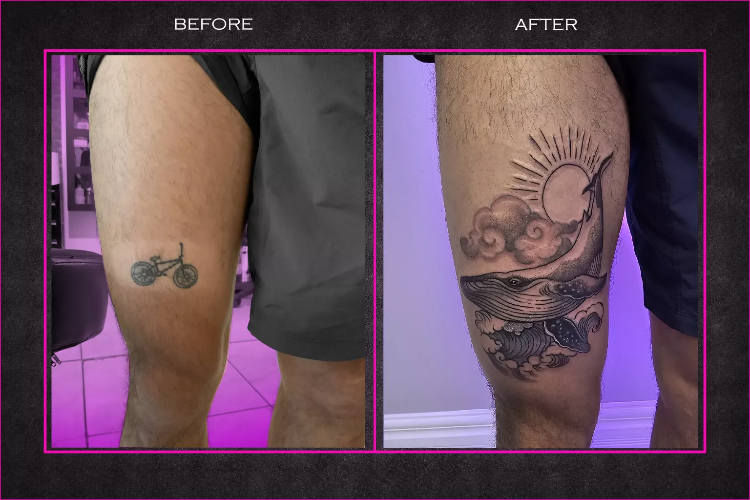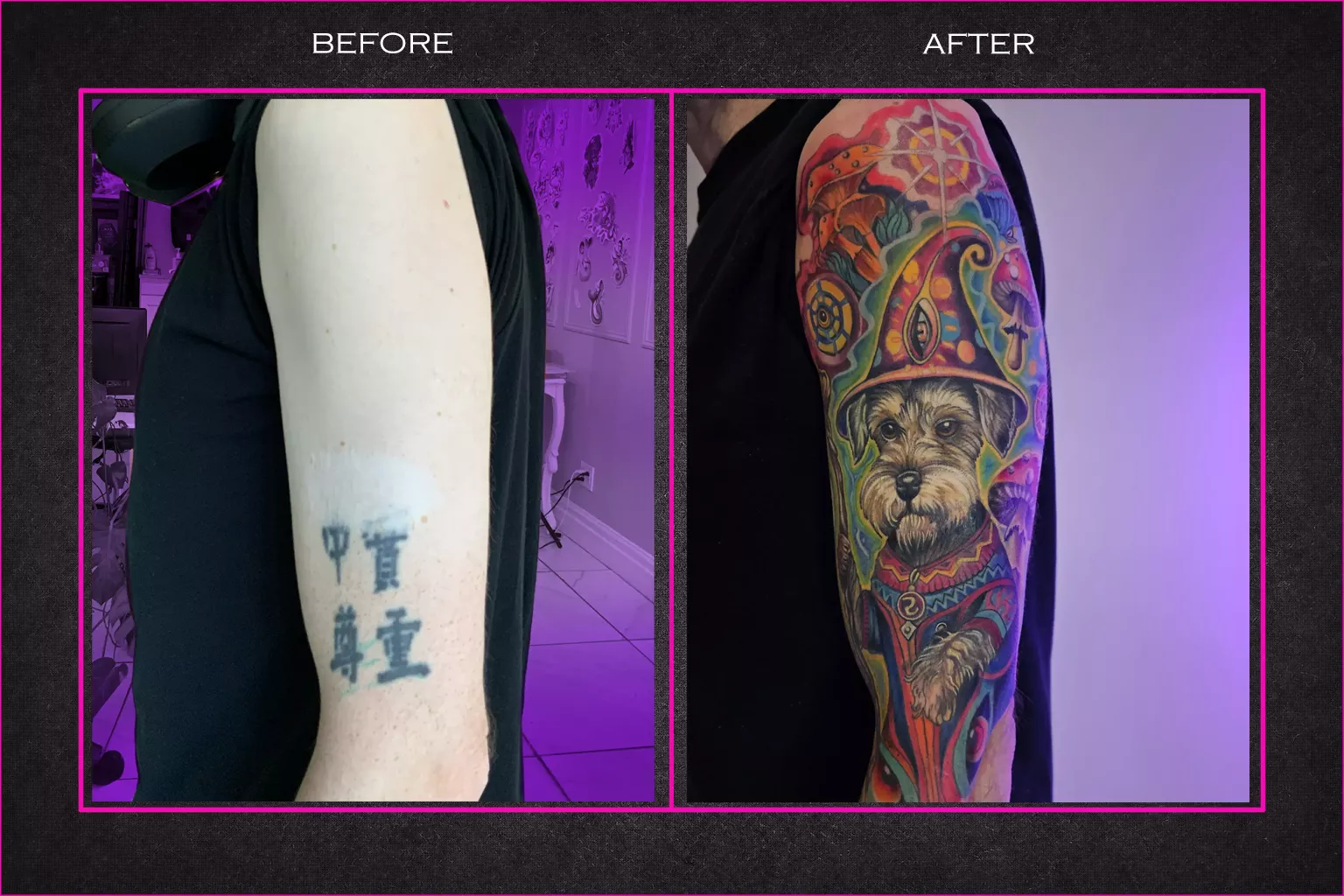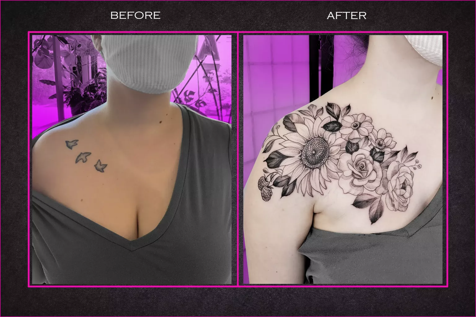 A cover-up tattoo is a specialized technique used to redesign and conceal an existing tattoo usingsize, contrast, and placement in a strategic way.