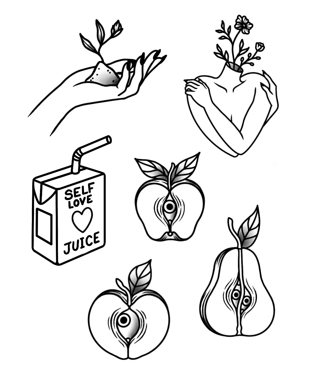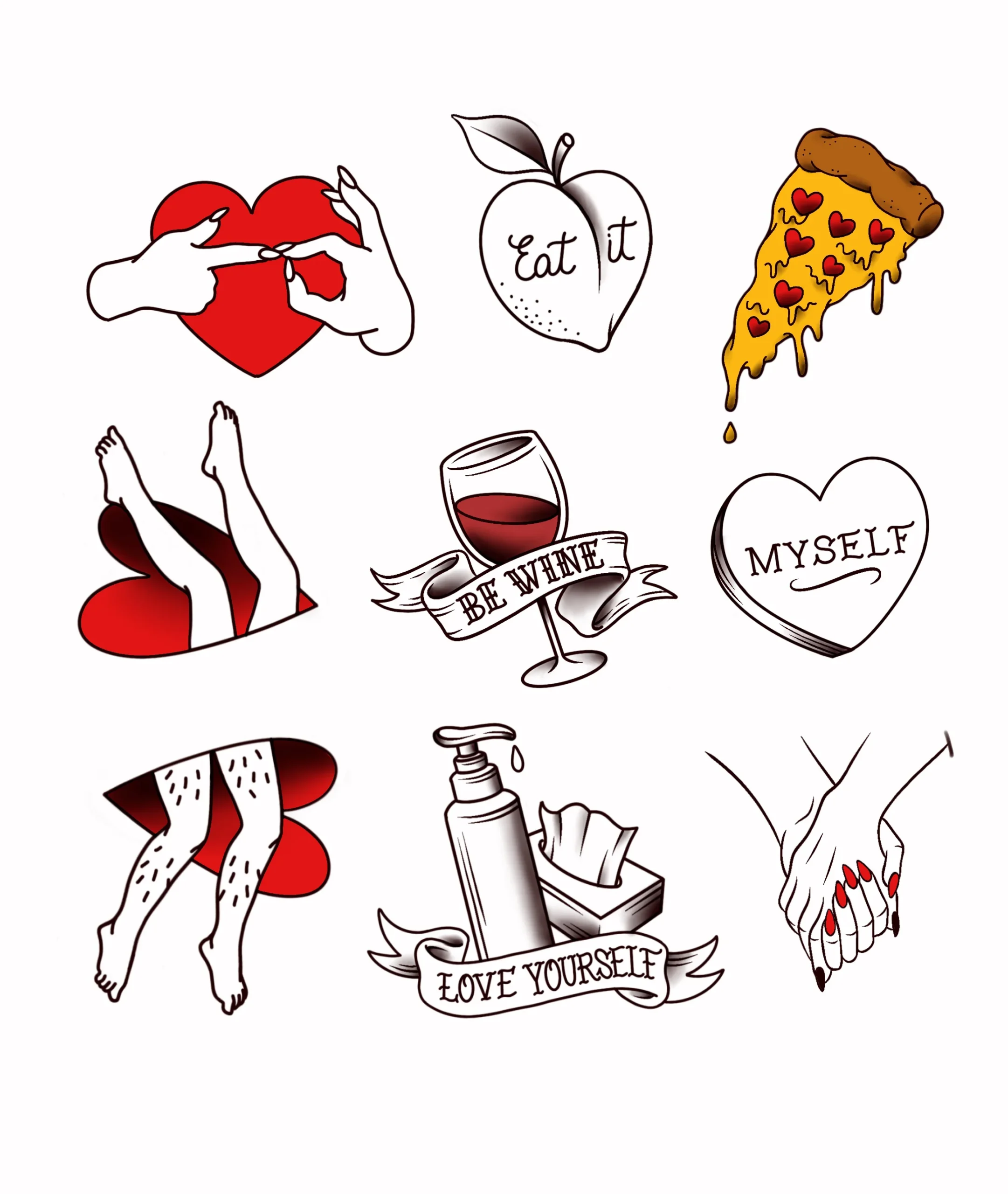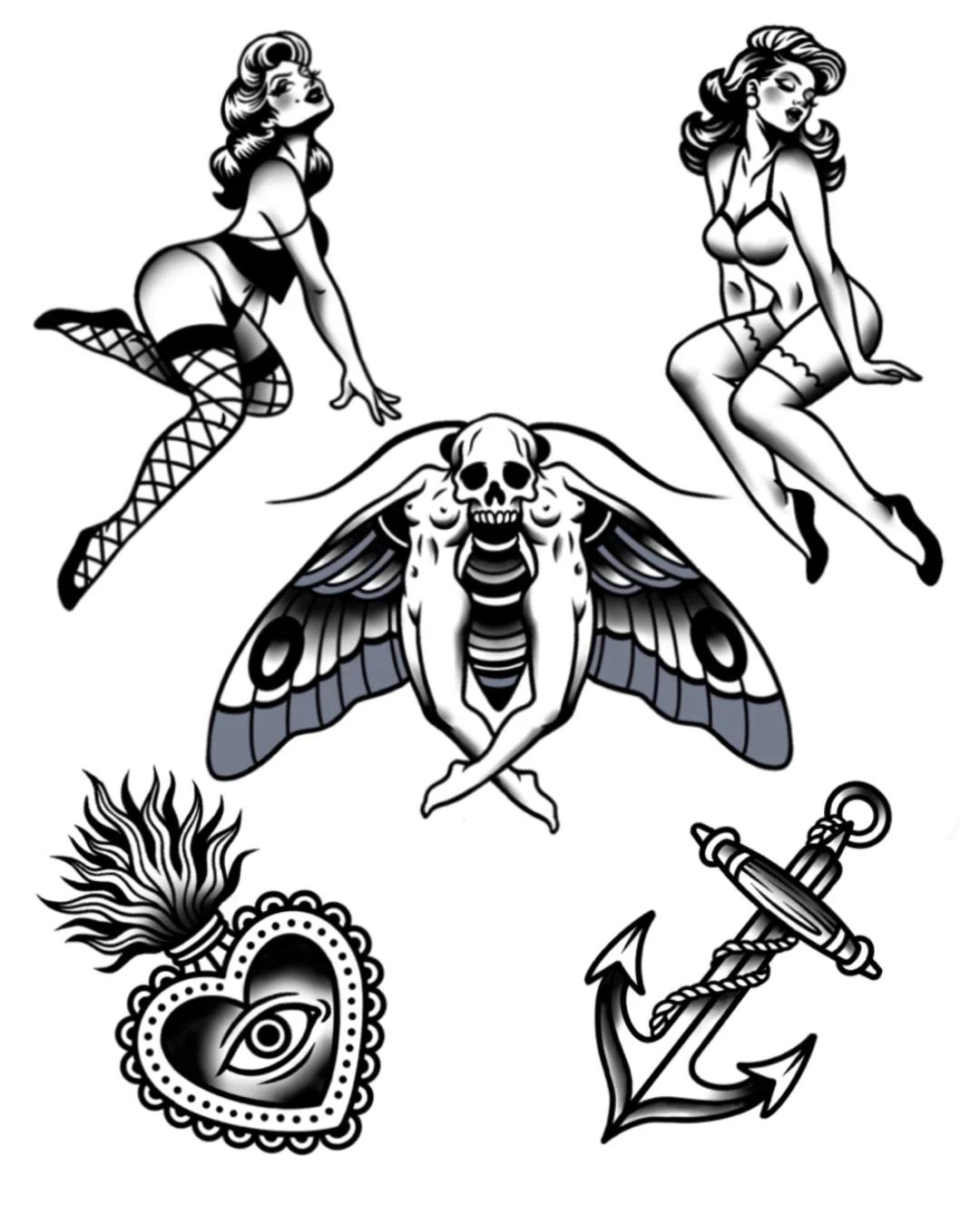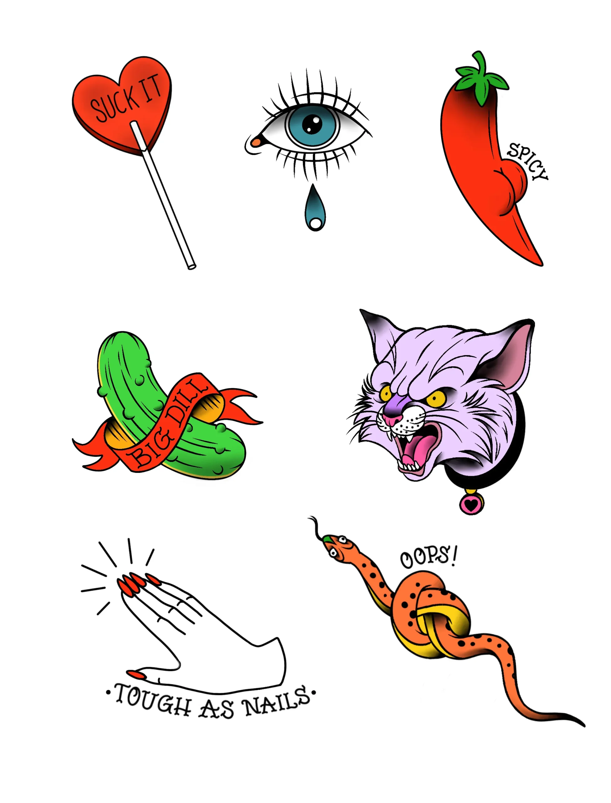 It’s bold, yes — rooted in traditional tattooing — but it’s also unpredictable. Mischievous. A little chaotic in the best way. One minute it’s a clean, minimal feminine figure, the next it’s a smoking fish that says “oui.”