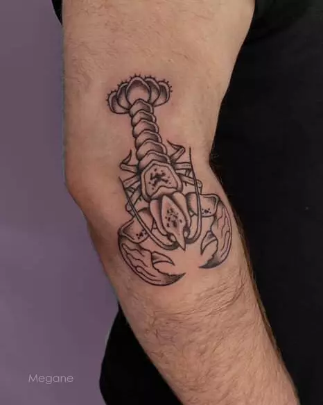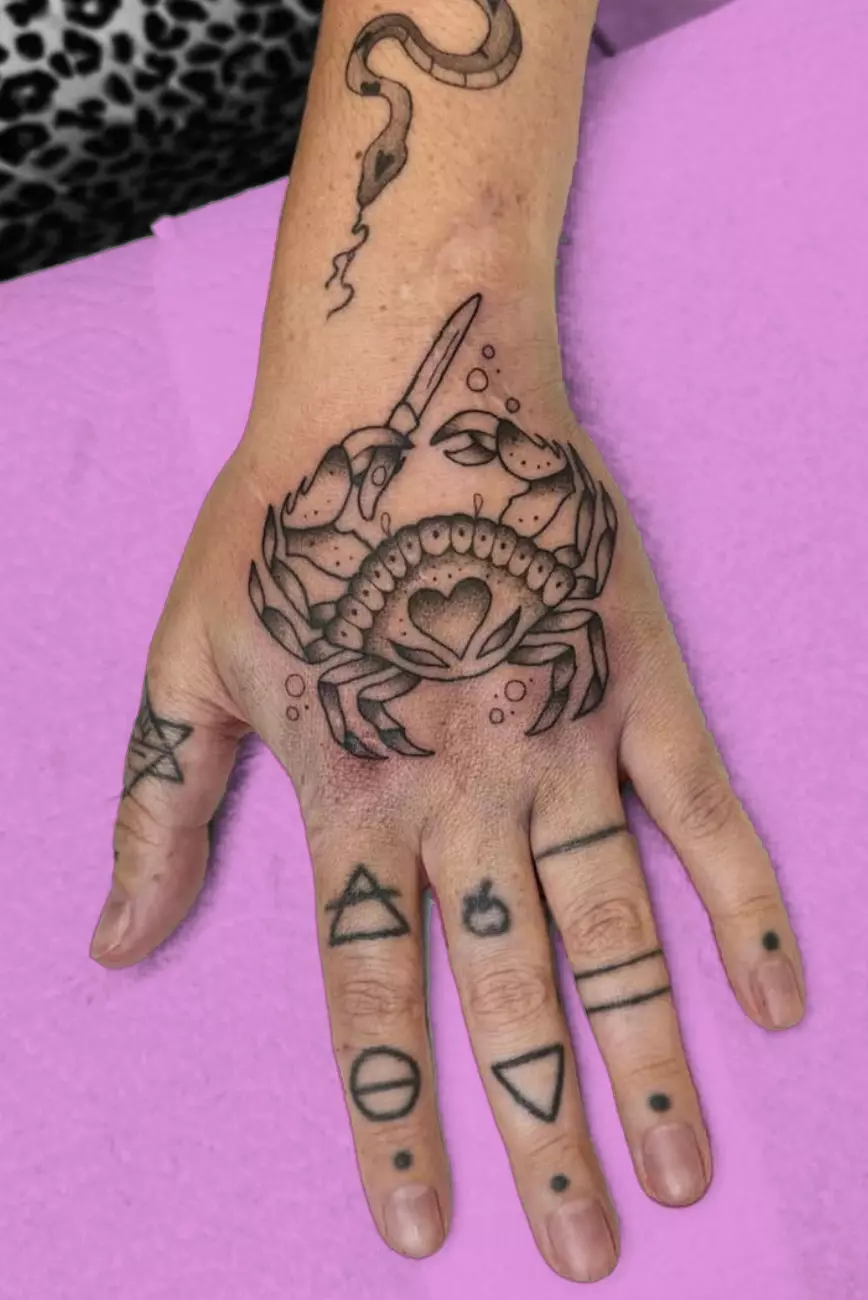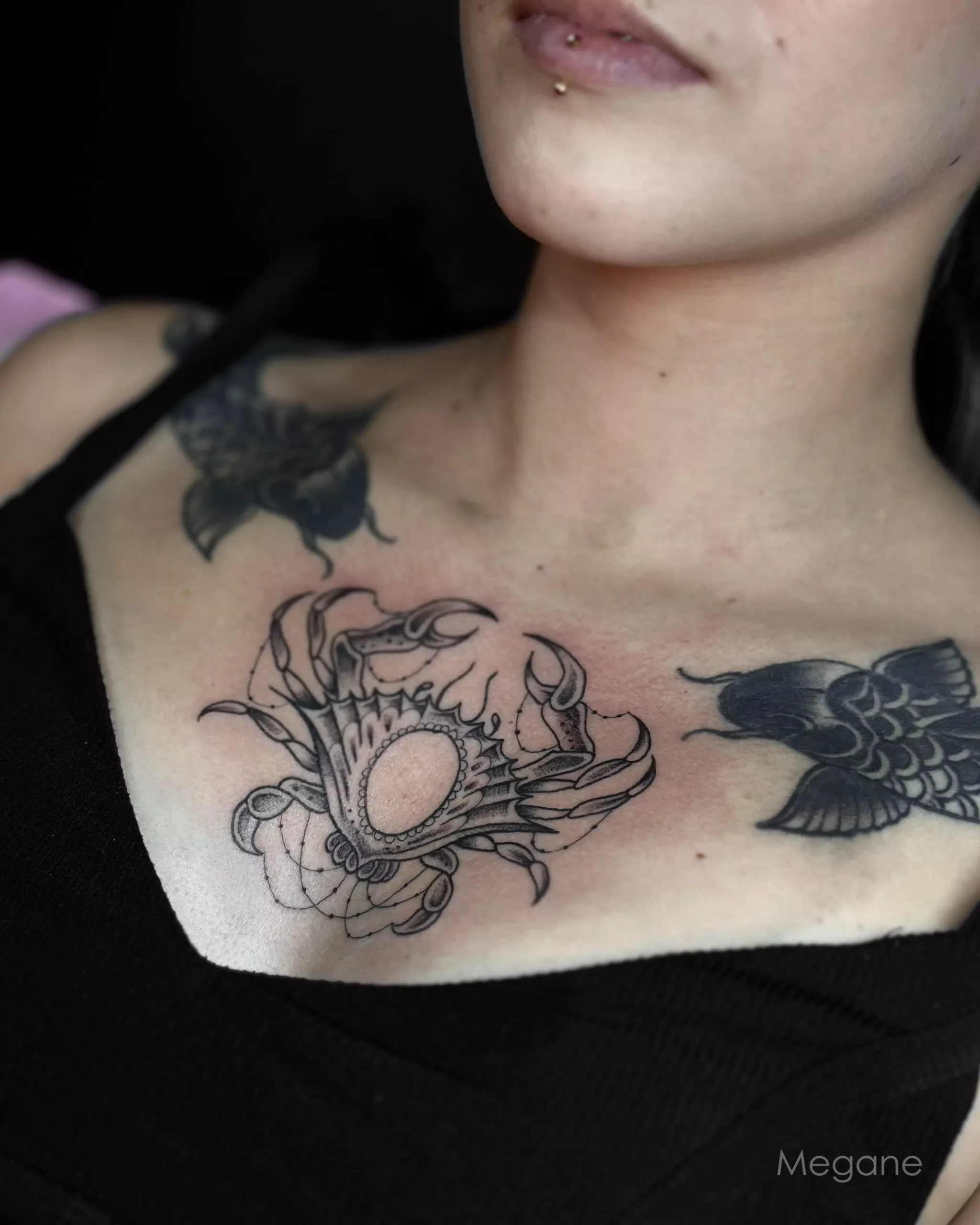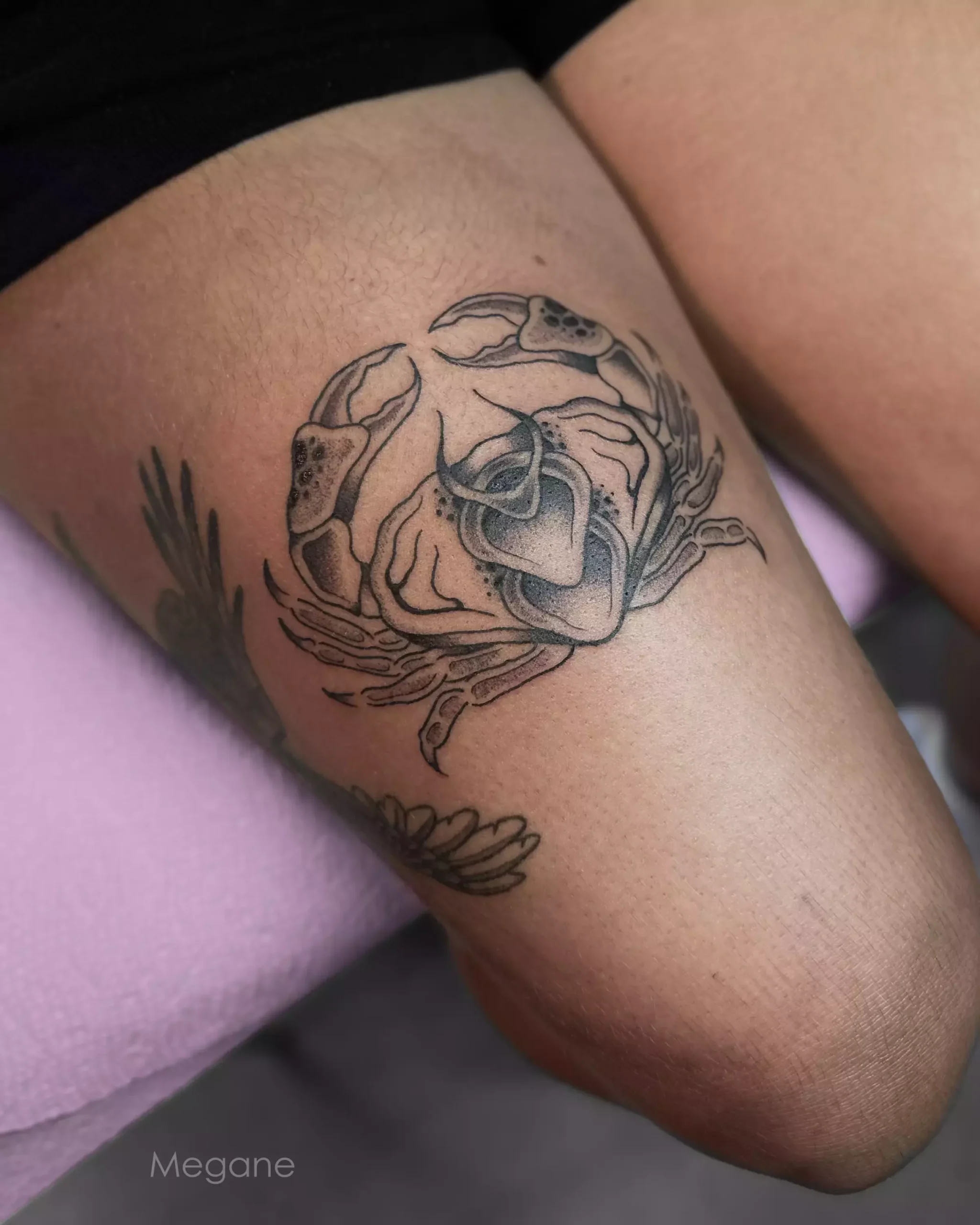 Crab and lobster tattoos shown are by Megane, whose work spans traditional and ornamental styles.