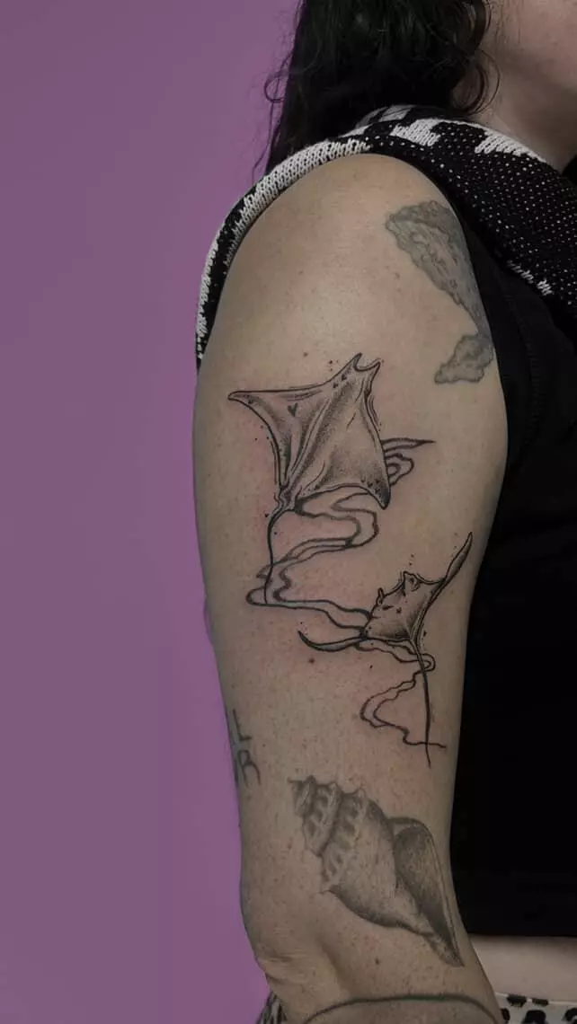 Rays gentle and melodic in motion remain friendly and curious animals. They make such a beautif flowing tattoo, like birds of the ocean. whale flash by Abby, ray tattoo by Ali