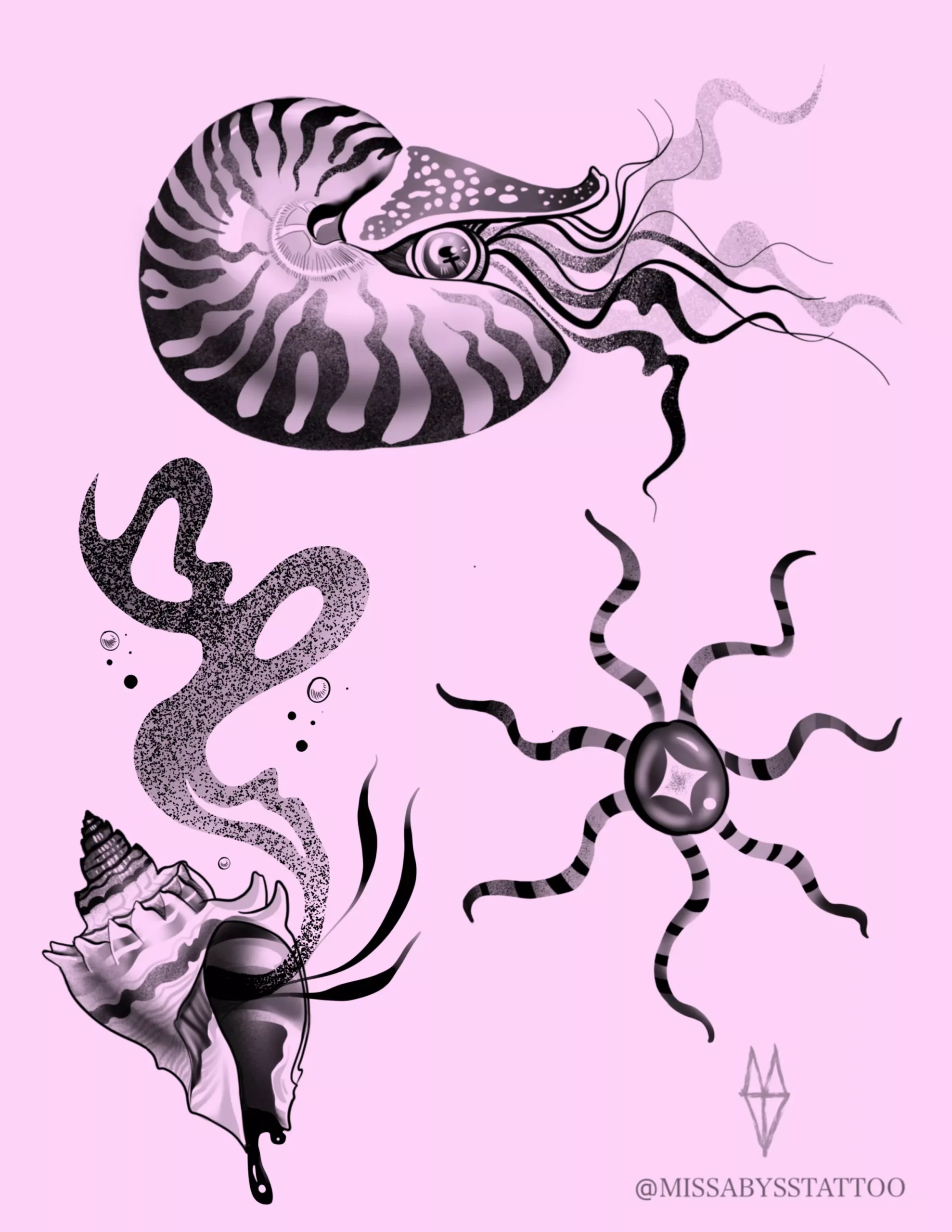 Fine line Shell flash and tattoos by Ali. Nautilus flash sheet by Abby