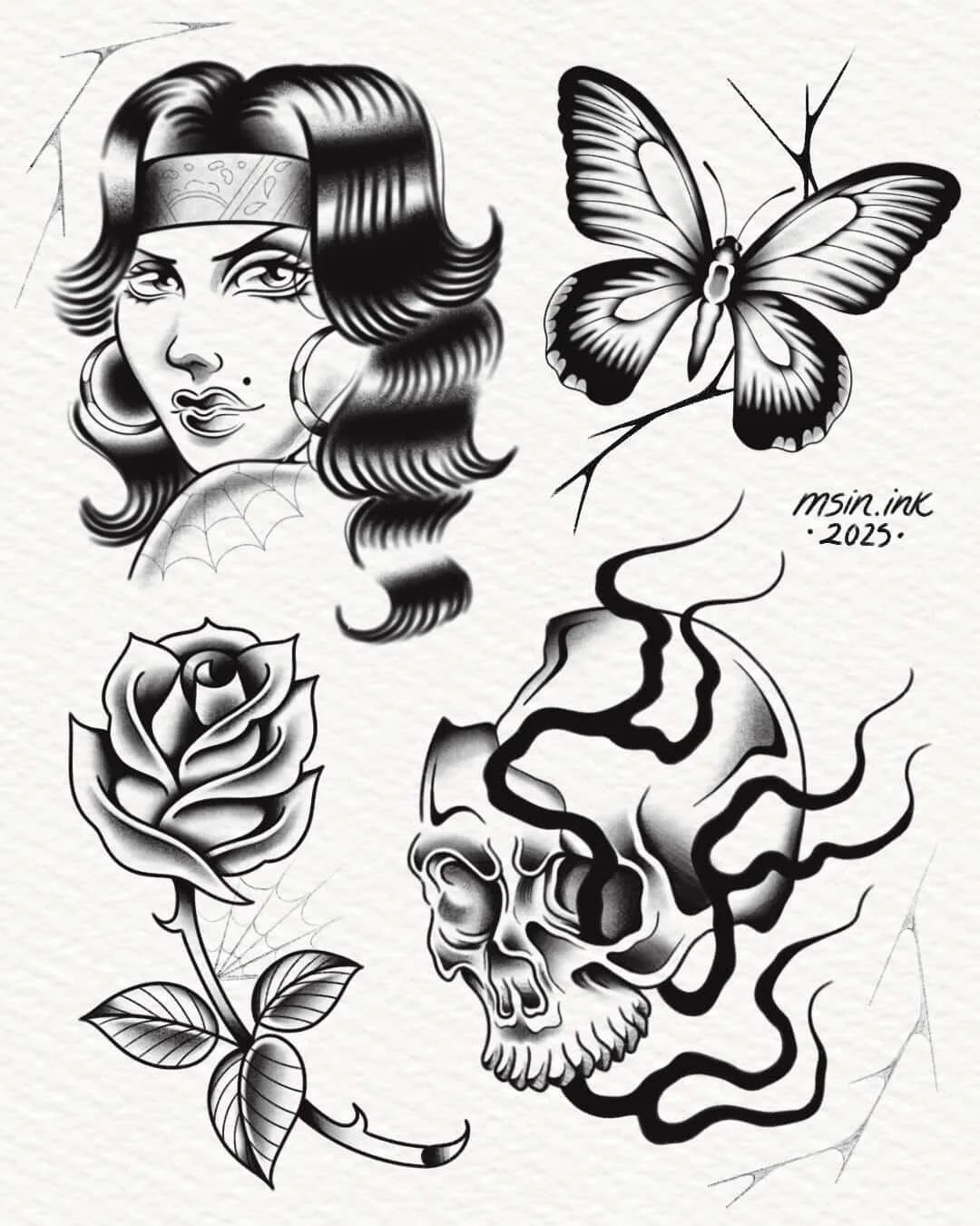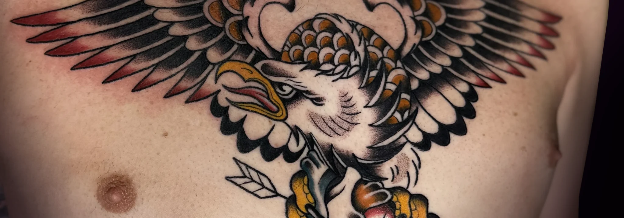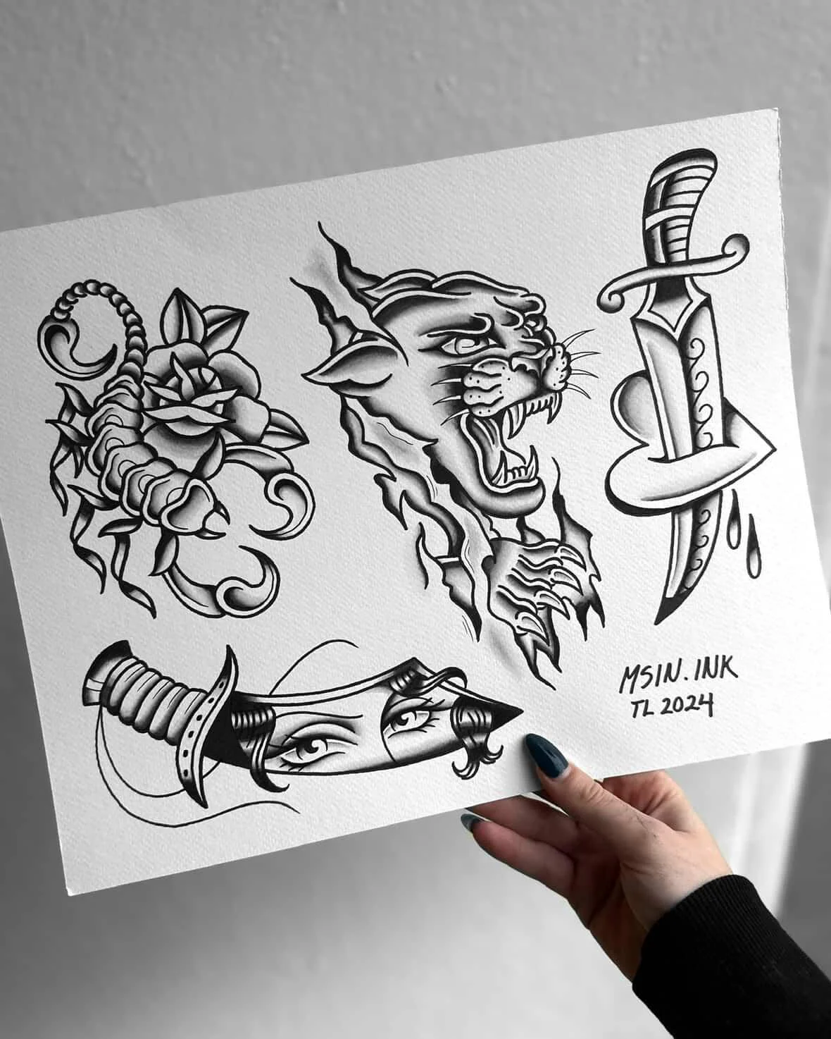 While traditional tattoos often include classic imagery like eagles, panthers, roses, daggers, and pin-ups, today’s artists are constantly evolving the style.