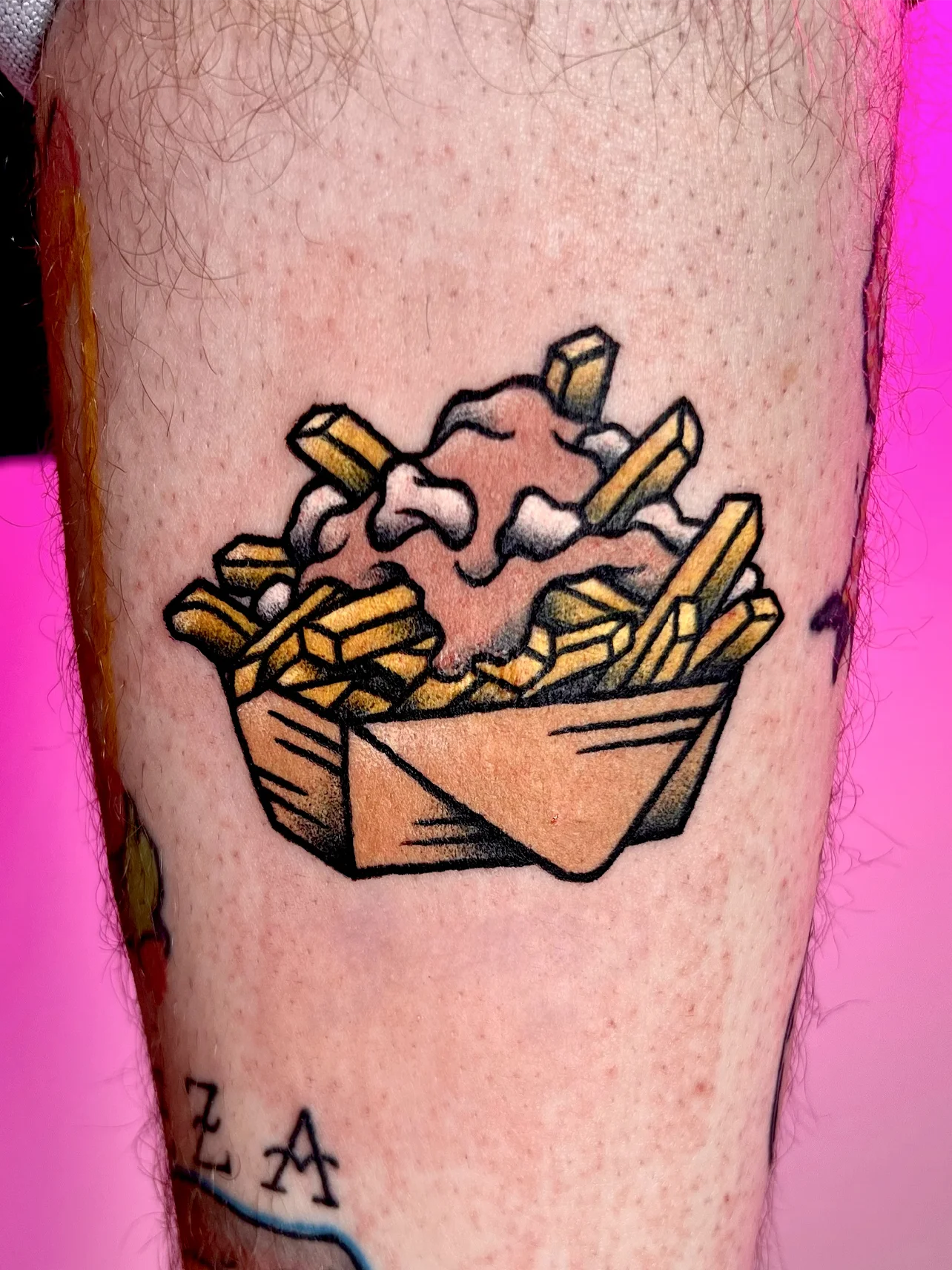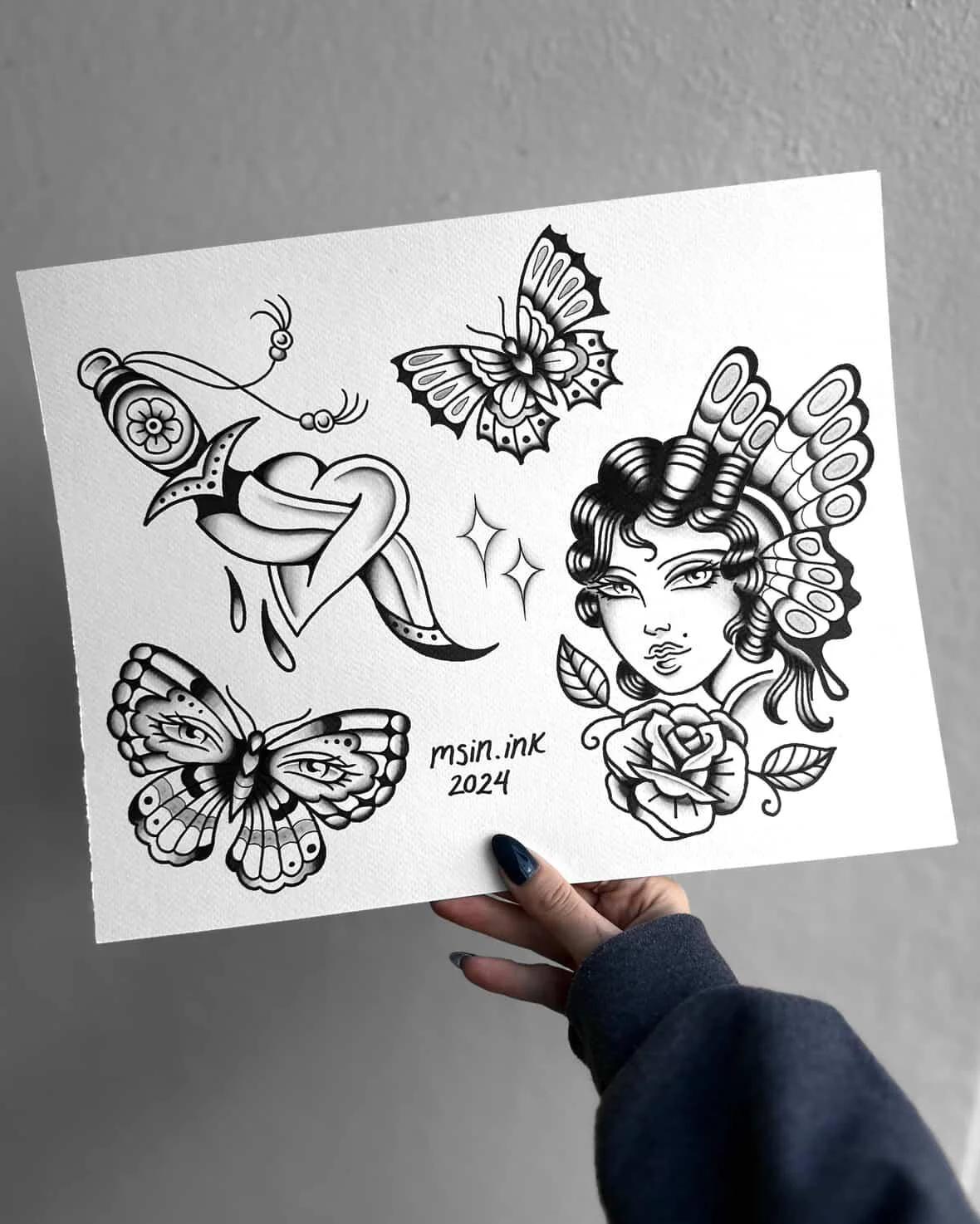 From classic flash-inspired pieces to quirky original ideas, her work captures the spirit of traditional tattooing while adding a modern sense of humor.